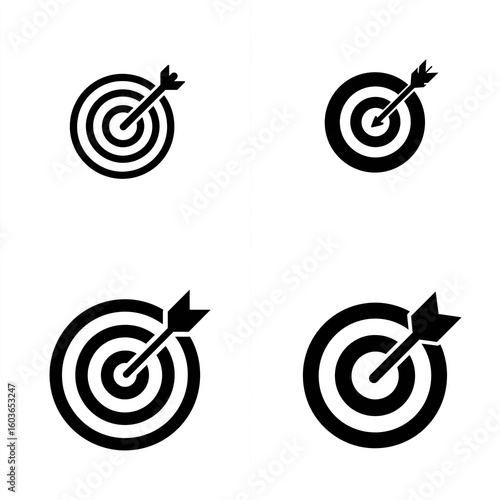 Four target icons with arrow in center, various sizes, isolated on white backdrop