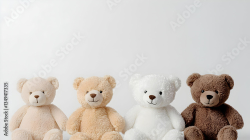 teddy bear, toy, plush, children, cute, soft, stuffed animal, brown, beige, white, sitting, row, group, playful, adorable, children, gift, childhood, pastel, neutral, simple, display, still life, background, white background, light, teddy, bear, 4, light brown