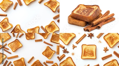 Four views of toasted bread slices, cinnamon sticks, and star anise, arranged on a white background
