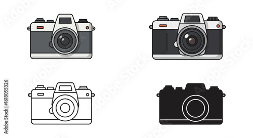 Four Vintage Camera Illustrations in Color Outline and Silhouette Styles