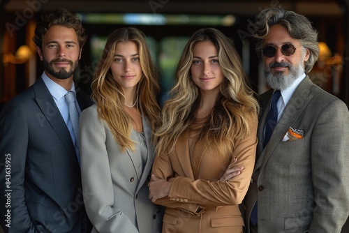 Four well-dressed professionals pose, conveying confidence and team spirit, in a corporate setting