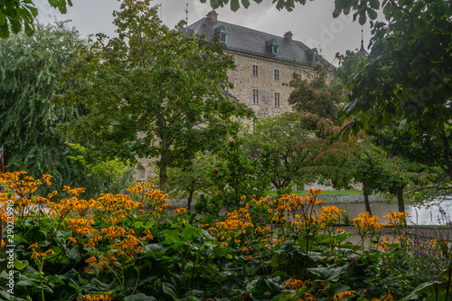 Fragment of Orebro castle with flowers and trees. Castle view from park side. Travel photo, background or illustration.