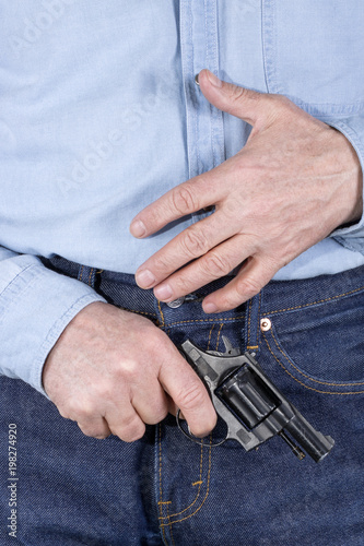 handgun, weapon, iron, barrel, trigger, hammer, handle, drum, revolver, fragment, man, jean, body, shirt, detective, belt, riddle, readiness, safety, protection, hand, compress, hold