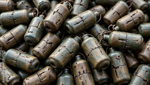Fragmentation grenades in various shades of green, showcasing rugged and worn appearance, evoke sense of military history and strategy