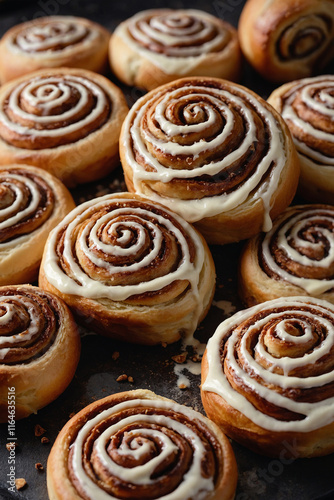 Fragrant freshly baked cinnabon rolls with glaze. Sweet pastries with cinnamon, perfect for tea or dessert. Close-up shows off the delicious look and airy texture