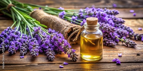 Fragrant lavender blossoms and essential oil rest on rustic wood.
