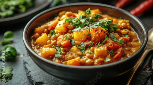 Fragrant Lentil and Vegetable Curry in Colorful Presentation Bowl, Hearty and Healthy Vegan Dish