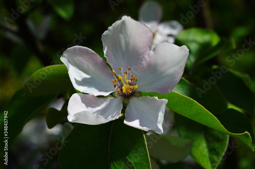 Fragrant young white flower on blossoming quince tree in sunny spring morning