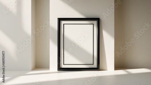 Frame leaning against the wall in a bright room with sunlight and shadow. Minimalist interior decor. Empty picture frame with a clean, modern design.