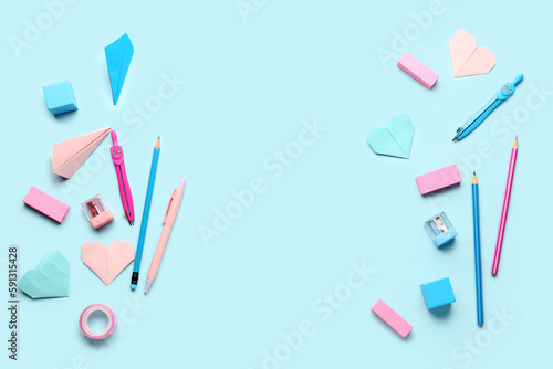 Frame made of school stationery on blue background. Children's Day celebration
