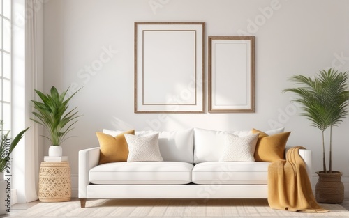 Frame mockup in bright living room design, white sofa in farmhouse boho interior style, 3d render