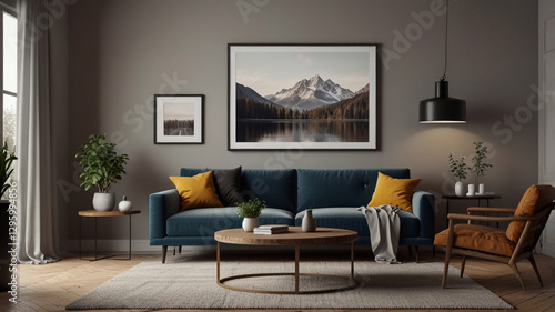 Frame mockup, ISO A paper size. Living room wall poster mockup. Interior mockup with house background. Modern interior design