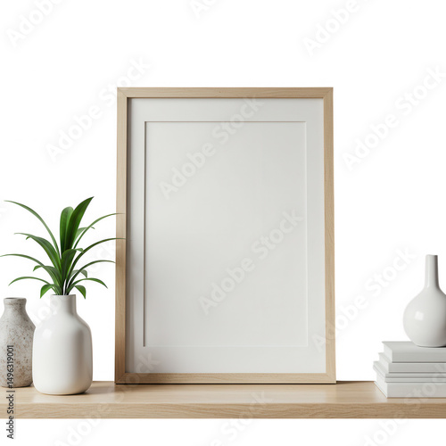 frame, art, design, interior, blank, plant, vase, decoration, home, wooden, table, book, white, displayed, with, element, ideal