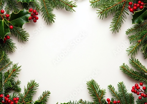 Framery of natural green Christmas tree branches with red hawthorn berries, blank copyspace isolated on a white background