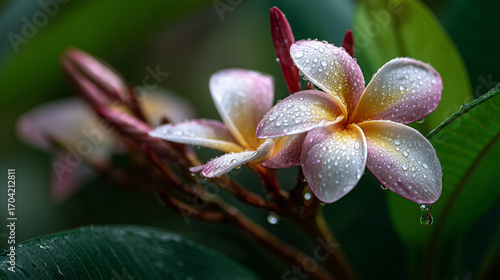 Frangipani flower with raindrops on petals.