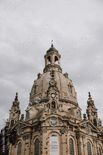 Frauenkirche, Dresden, Germany. Church of Our Lady with soap bubbles in foreground.