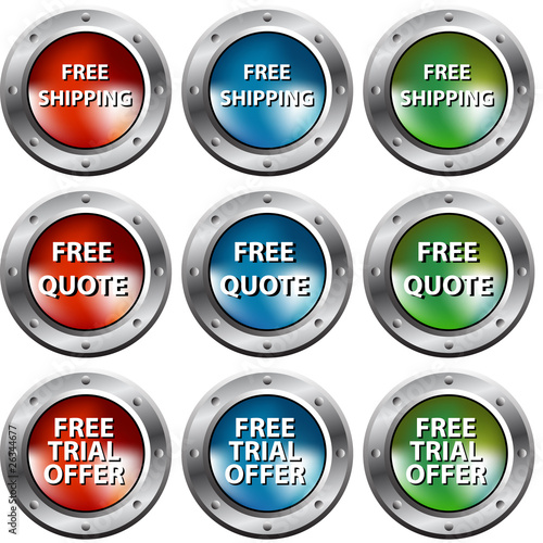 buttons, business, icon, free, chrome, metal, rivet, buttons, set, icon, silver, round, red, blue, green, ruby, gem, shiny, shipping, quote, trial, offer, black, isolated, white, illustration, graphic, clip, art, clip art, vector
