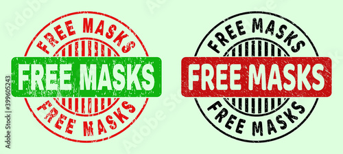 FREE MASKS bicolor round watermarks with corroded style. Flat vector distress seal stamps with FREE MASKS caption inside round shape, in red, black, green colors. Rounded bicolour seal stamps.
