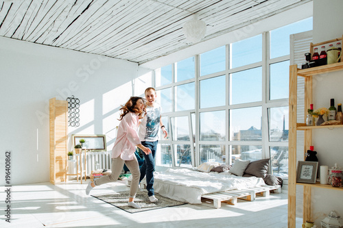Free time together. Happy beautiful couple is spending weekend together at home, relaxing and enjoying the company of each other. home cosiness.The man and the woman run holding hands