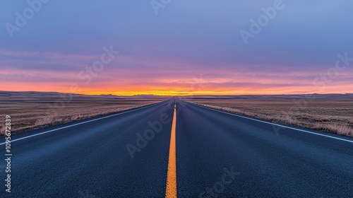 Freedom liberty and unrestricted, A serene road stretches into the horizon beneath a vibrant sunset, showcasing a blend of colors in the sky and a sense of tranquility.