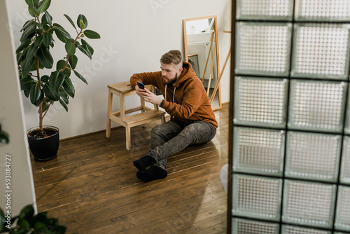 Freelance man using mobile phone checking social media network feed or message chat at home. Online digital communication and rest after hard work day