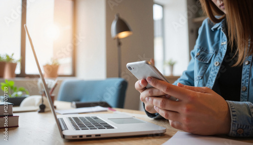 freelancer, electronic mail, smartphone, laptop, office, modern, sharpened, productivity, workspace, technology, person, female, adult, young, casual attire, denim, light, desk, indoor, organisation, professional, plant, natural light, soft, closeup, communication, connectivity, task, multitask, environment, home office, creativity, efficiency, contemporary, furniture, warming, ambience, arrangement, 1, hand, digital, tool, simplicity, balance, routine, lifestyle, idea