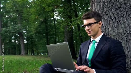 Freelancer sitting under tree in park and using laptop, remote work outdoors