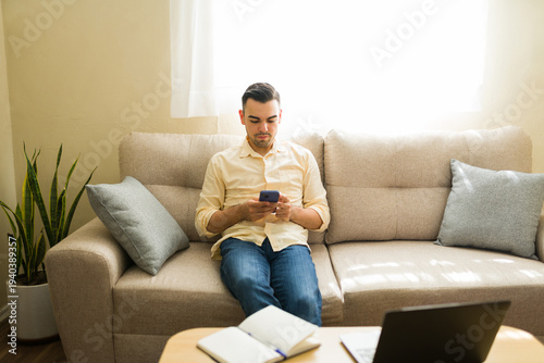 freelancer, man, smartphone, couch, living room, communication, connectivity, casual attire, technology, online, cyberspace, networking, text messaging, browsing, young adult, businessman, independent, entrepreneur, modern, relaxation, comfort, professional, domestic, indoor, houseplant, thinking, planning, research
