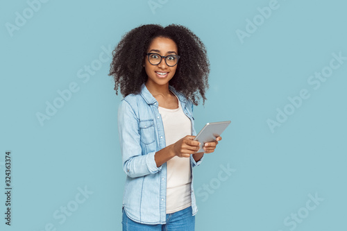 Freestyle. African girl in glasses standing isolated on gray browsing internet on digital tablet surprised