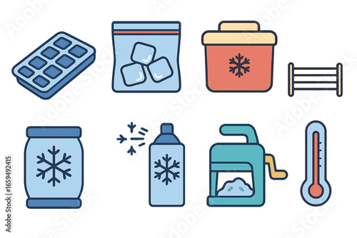 freezing, tool, icon, flat, vector, mini, illustration, liquid, colours, children, ice, cube, tray, deep freezer, bag, insulated, container, cooling, rack, cold, pack, frost, spray, crusher, thermometer, design, designed