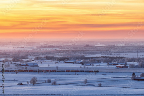 winter, landscape, snow, sunset, field, railway, train, freight train, rural, countryside, dusk, sky, cold, colourful, country, farmland, farm, no people, copy space, outdoors, twilight, golden hour, awesome, tranquility, frost, hoar frost, view, tree, wintery, light, nature, agricultural, frosty, snowy, sunlight, cultivated land, aerial view, sunny, scenic, glacé, scene, scenery, beautiful, plain, dawn, sunrise, horizon, sweden