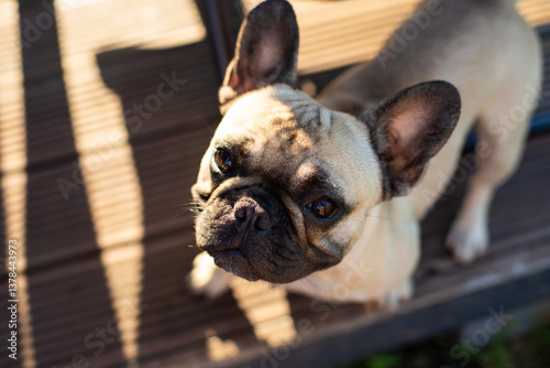 French Bulldog looking curiously in sunlight on wooden deck