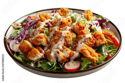 salad, crispy, chicken, dressing, fresh, colourful, meal, healthy, vegetable, greener, plate, alimentary, garnished, bowl, cookery, vibrant, lunch, food, delicious, herb, epicure, organic, shredded, slice, crunch, leafy, ranch, spicey, ingredient, serving, favor, nourishment, homemade, banquet, side, dish, wholesome, diet, cooked, presentation
