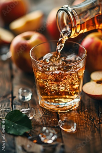 Fresh apple juice cider being poured into glass with apple fruit on table