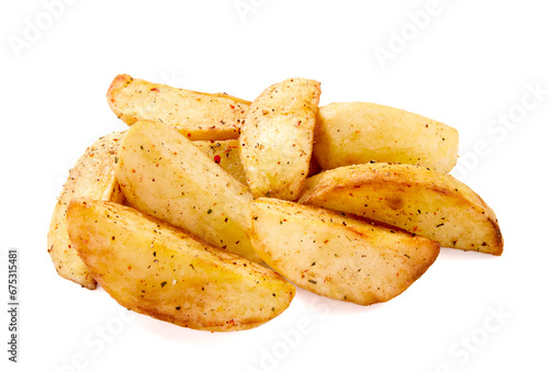 Fresh baked potato wedges with seasonings, on a white background
