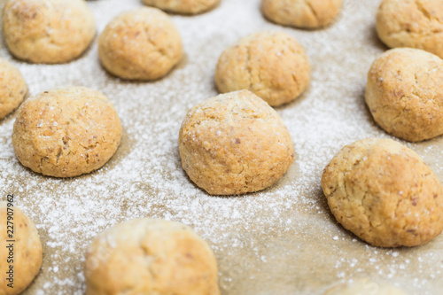 Fresh bakened Christmas nut cookies with icing sugar on baking tray