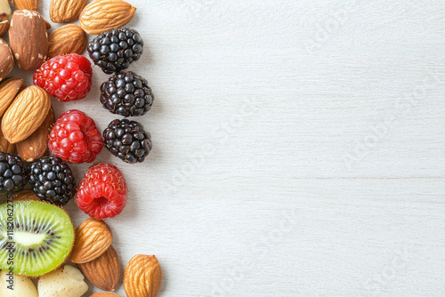 Fresh berries and nuts arranged on light wooden surface, showcasing vibrant colors and textures. This healthy mix includes almonds, raspberries, blackberries, and kiwi, perfect for snacking