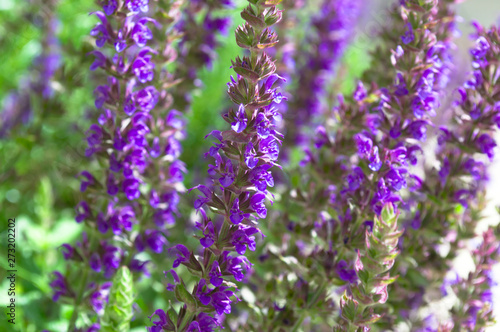 Fresh blue and purple flowers of sage is blooming in the green field. Front view close up.