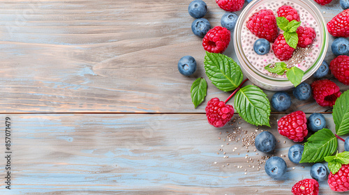 Fresh blueberries, raspberries and mint leaves surrounding a bowl of chia pudding on a rustic wooden background.