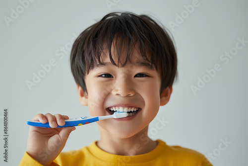 Fresh Breath Day. A young kid smiling while brushing his teeth, wearing yellow. he has clean, shiny teeth