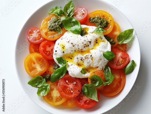 Fresh caprese salad with colorful tomatoes mozzarella basil pesto and olive oil on white plate