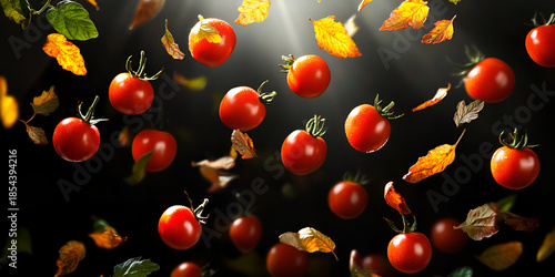 Fresh Cherry Tomatoes Falling with Leaves on Dark Background
