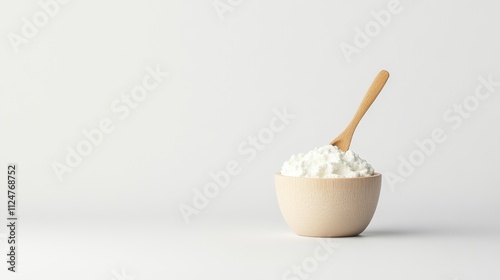 Fresh Cottage Cheese in a Creamy Bowl with a Wooden Spoon on a Minimalist Surface, Perfect for Healthy Eating and Culinary Inspiration