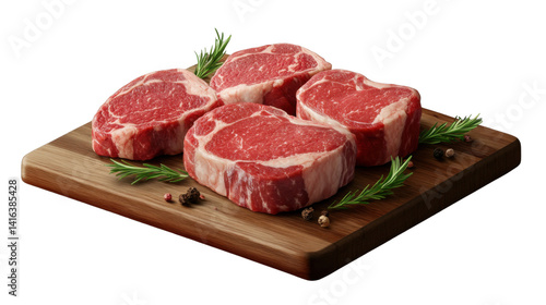 Fresh Cuts on Display: A close-up shot reveals raw, juicy steaks artfully arranged on a wooden cutting board, complemented by fresh herbs and peppercorns.
