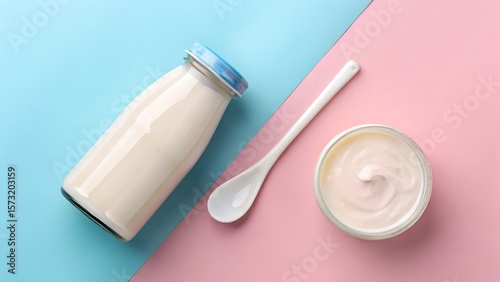 Fresh Dairy Products: Milk, Yogurt, and Spoon on Pastel Blue and Pink Background