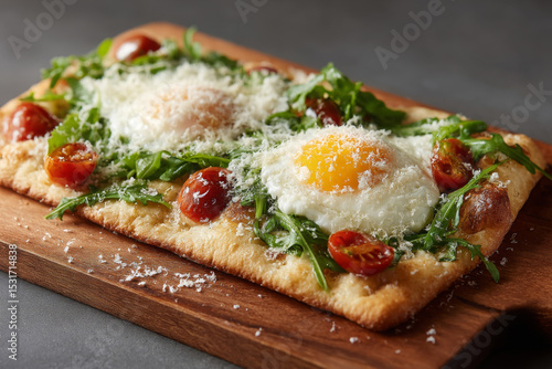 Fresh flatbread topped with eggs, arugula, and cherry tomatoes, creating delicious breakfast