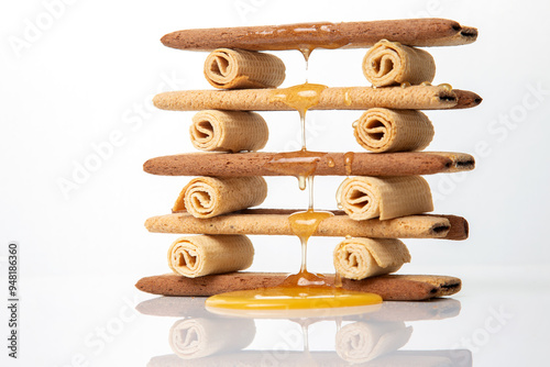 Fresh flower honey flows and drips onto herdry crispy cookie sticks. Dessert snack food.