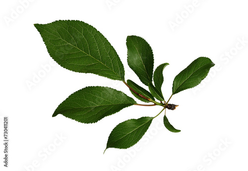 Fresh fruit tree branch with green leaves isolated on white background. Element for creating collage, designs, cards, patterns, floral arrangements, frames, wedding cards and invitations.