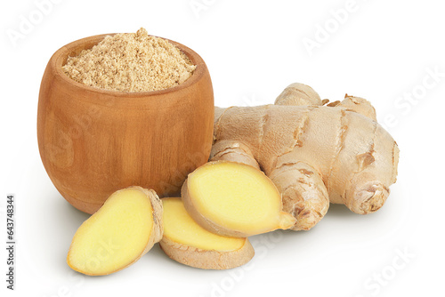 fresh ginger and ground ginger in wooden bowl spice isolated on white background
