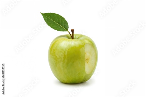 Fresh green apple with a leaf and a cut piece on a white backdrop with no shadows